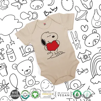 Snoopy takemy heart, Βρεφικό φορμάκι μωρού, 0-18 μηνών, Natural (Εκρού), 100% Organic Cotton, κοντομάνικο