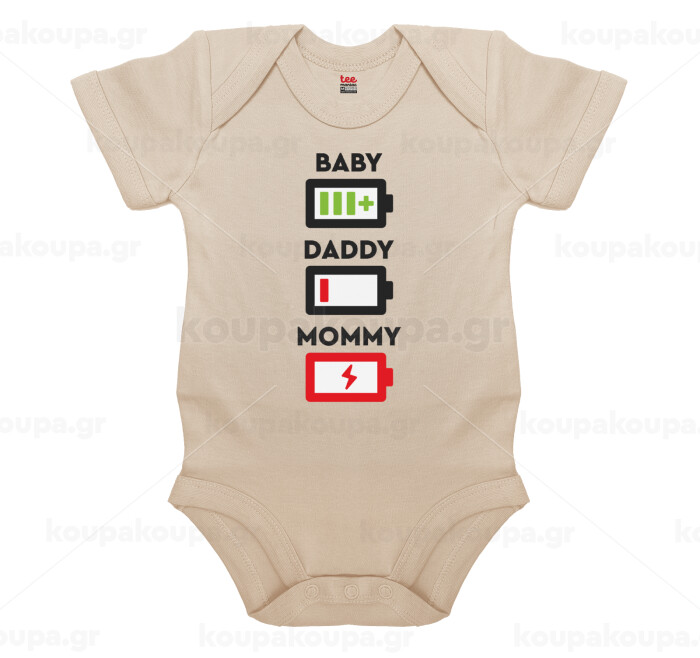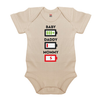 BABY, MOMMY, DADDY Low battery, Βρεφικό φορμάκι μωρού, 0-18 μηνών, Natural (Εκρού), 100% Organic Cotton, κοντομάνικο