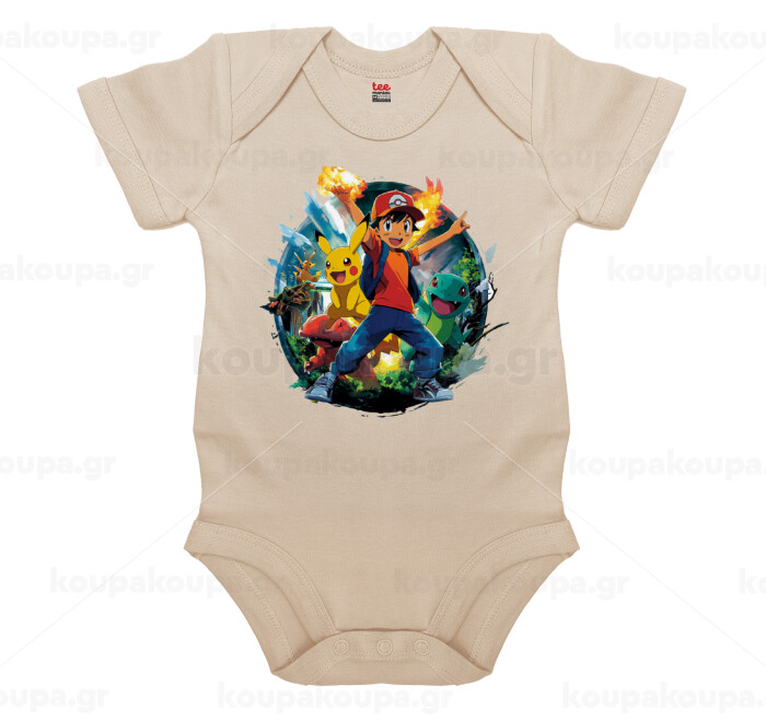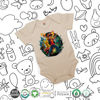 Ash Ketchum & Pikachu, Βρεφικό φορμάκι μωρού, 0-18 μηνών, Natural (Εκρού), 100% Organic Cotton, κοντομάνικο