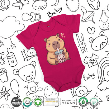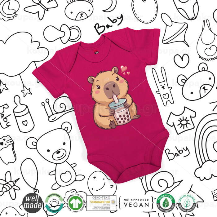 Capybara Bubble Tea, Βρεφικό φορμάκι μωρού, 0-18 μηνών, ΡΟΖ, 100% Organic Cotton, κοντομάνικο