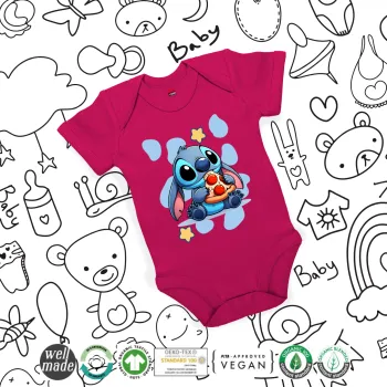 Stitch Pizza, Βρεφικό φορμάκι μωρού, 0-18 μηνών, ΡΟΖ, 100% Organic Cotton, κοντομάνικο