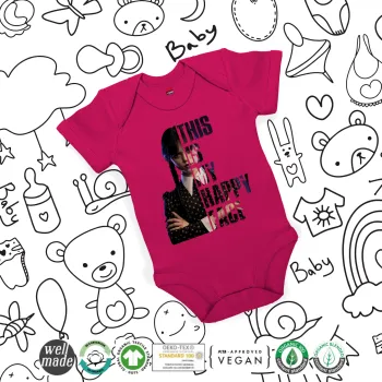 Wednesday, This is my happy face, Βρεφικό φορμάκι μωρού, 0-18 μηνών, ΡΟΖ, 100% Organic Cotton, κοντομάνικο