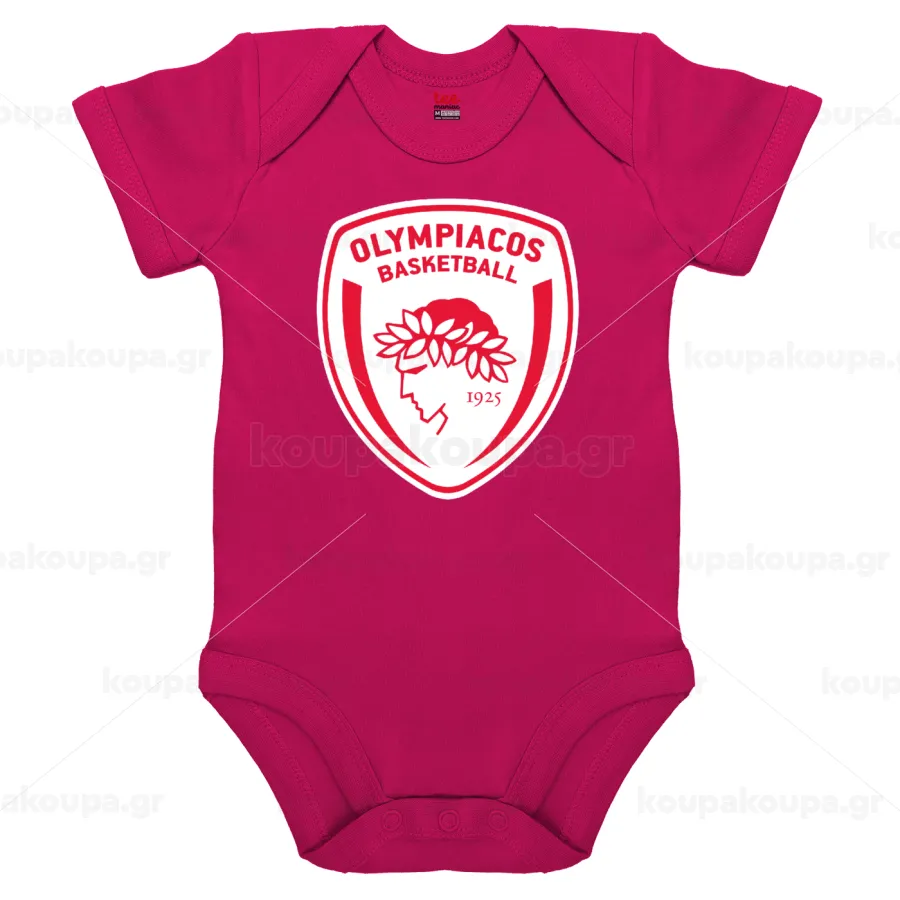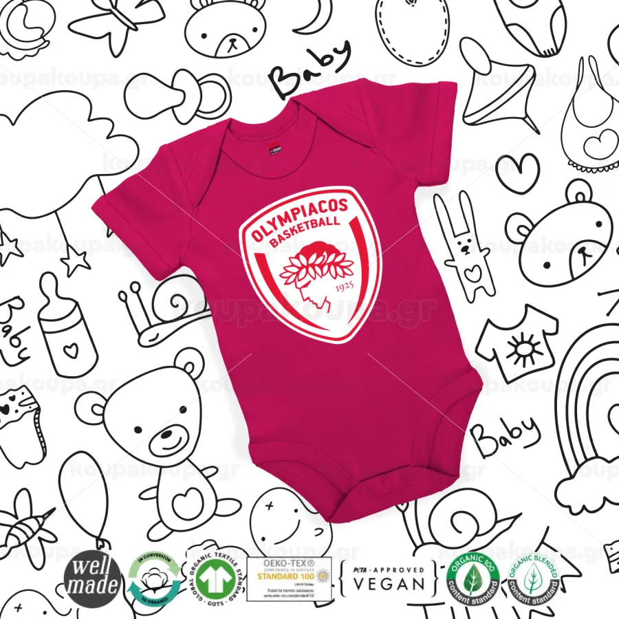Olympiacos B.C., Βρεφικό φορμάκι μωρού, 0-18 μηνών, ΡΟΖ, 100% Organic Cotton, κοντομάνικο