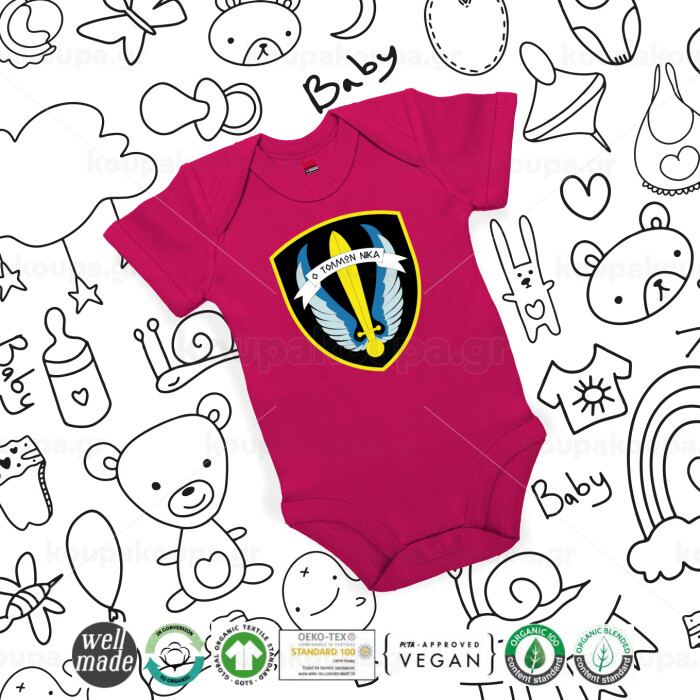 Έμβλημα Μονάδων Καταδρομών Ο Τολμων Νικα - Λοκ, Βρεφικό φορμάκι μωρού, 0-18 μηνών, ΡΟΖ, 100% Organic Cotton, κοντομάνικο