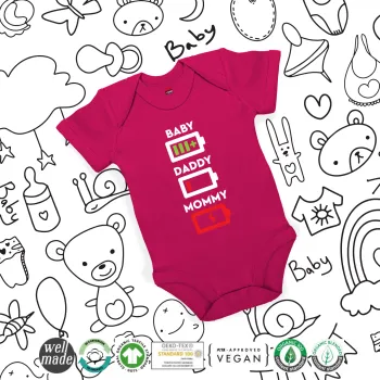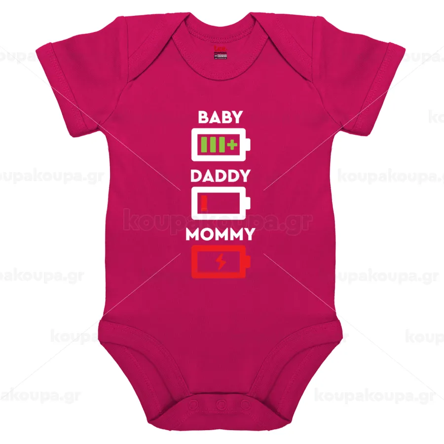 BABY, MOMMY, DADDY Low battery, Βρεφικό φορμάκι μωρού, 0-18 μηνών, ΡΟΖ, 100% Organic Cotton, κοντομάνικο