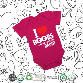 I Love boobs ...just like my daddy, Βρεφικό φορμάκι μωρού, 0-18 μηνών, ΡΟΖ, 100% Organic Cotton, κοντομάνικο
