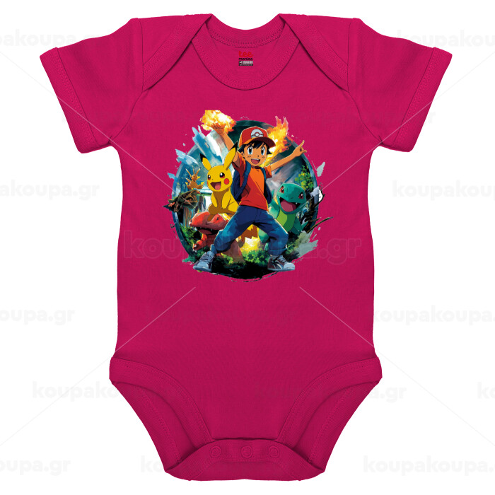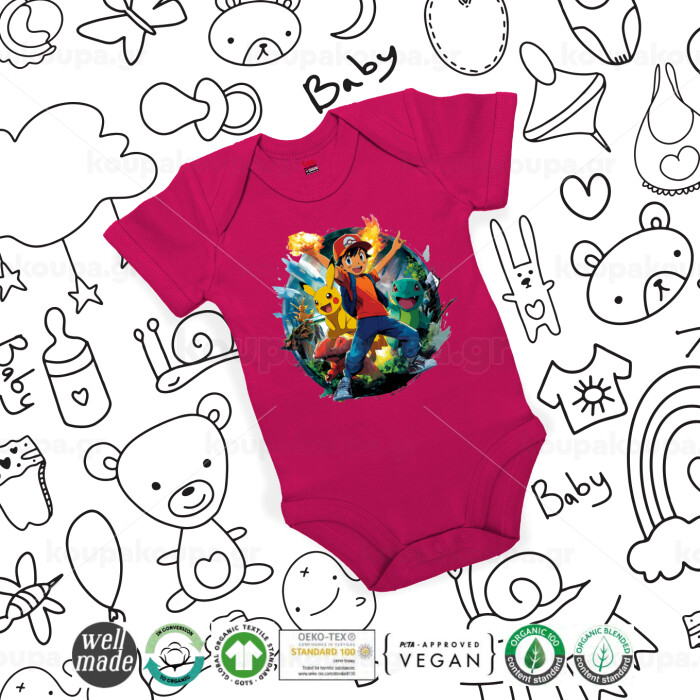 Ash Ketchum & Pikachu, Βρεφικό φορμάκι μωρού, 0-18 μηνών, ΡΟΖ, 100% Organic Cotton, κοντομάνικο