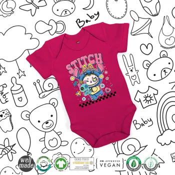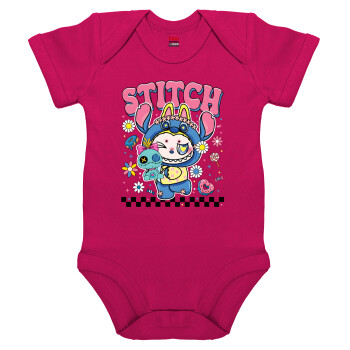 Labubu Stitch, Βρεφικό φορμάκι μωρού, 0-18 μηνών, ΡΟΖ, 100% Organic Cotton, κοντομάνικο