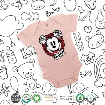 Mickey Mouse, Βρεφικό φορμάκι μωρού, 0-18 μηνών, ΡΟΖ POWDER, 100% Organic Cotton, κοντομάνικο