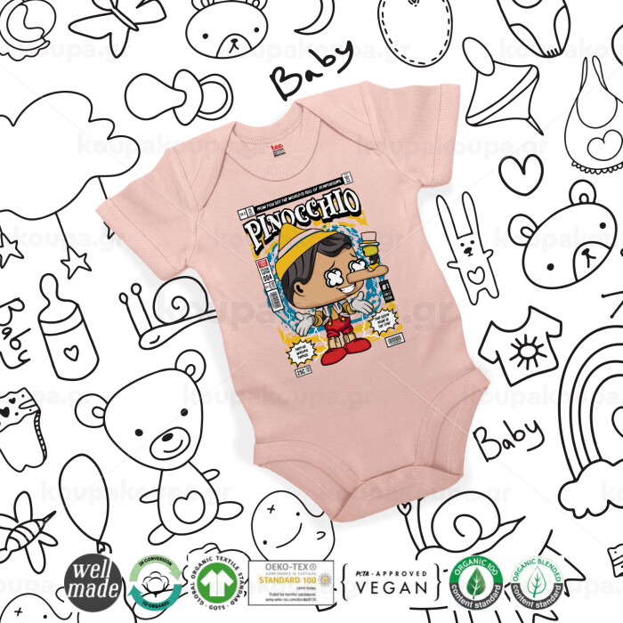 Pinocchio, Βρεφικό φορμάκι μωρού, 0-18 μηνών, ΡΟΖ POWDER, 100% Organic Cotton, κοντομάνικο