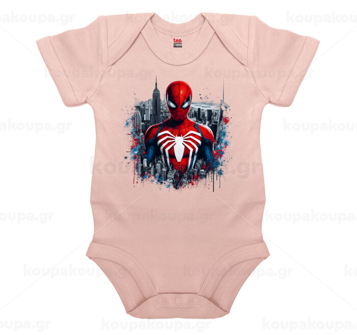 Spiderman City, Βρεφικό φορμάκι μωρού, 0-18 μηνών, ΡΟΖ POWDER, 100% Organic Cotton, κοντομάνικο