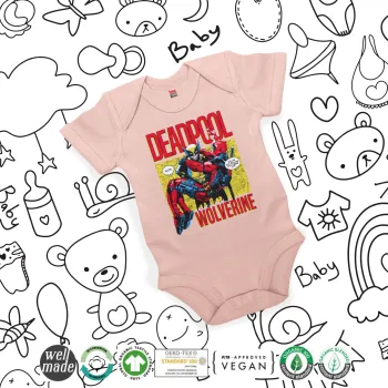 Superhero Deadpool Wolverine, Βρεφικό φορμάκι μωρού, 0-18 μηνών, ΡΟΖ POWDER, 100% Organic Cotton, κοντομάνικο