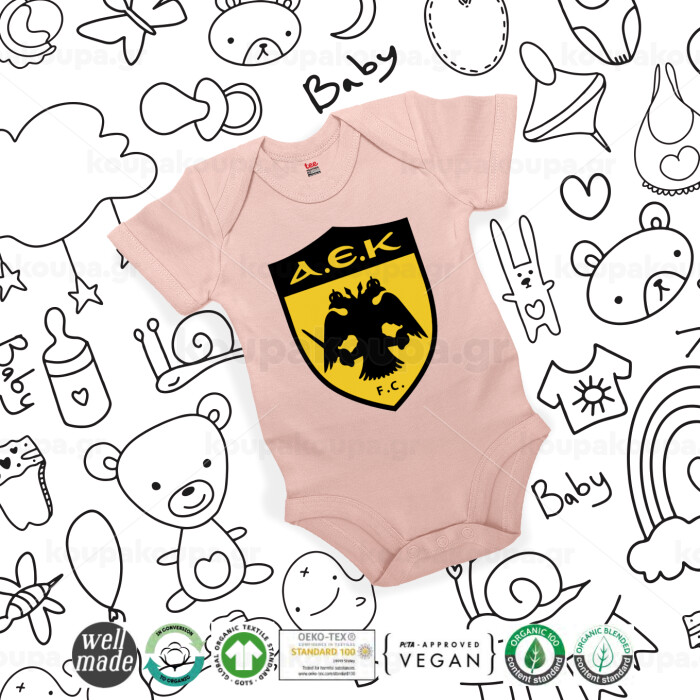 ΑΕΚ, Βρεφικό φορμάκι μωρού, 0-18 μηνών, ΡΟΖ POWDER, 100% Organic Cotton, κοντομάνικο