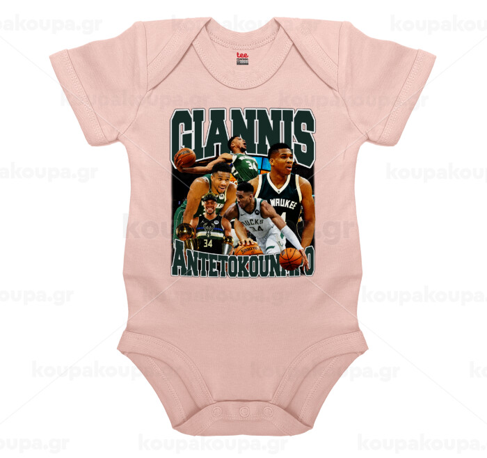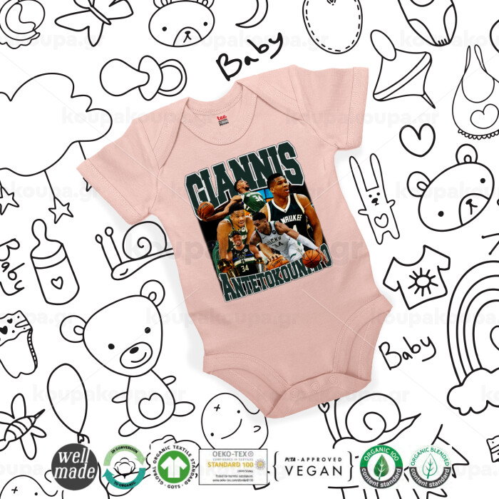 Giannis Antetokounmpo, Βρεφικό φορμάκι μωρού, 0-18 μηνών, ΡΟΖ POWDER, 100% Organic Cotton, κοντομάνικο