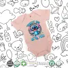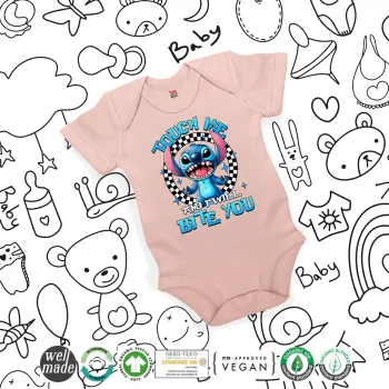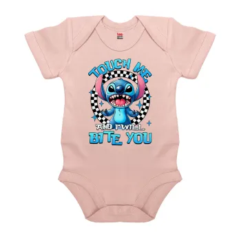 Stitch Touch Me And I Will Bite You, Βρεφικό φορμάκι μωρού, 0-18 μηνών, ΡΟΖ POWDER, 100% Organic Cotton, κοντομάνικο