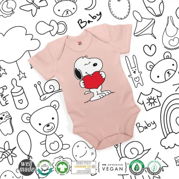 Snoopy takemy heart, Βρεφικό φορμάκι μωρού, 0-18 μηνών, ΡΟΖ POWDER, 100% Organic Cotton, κοντομάνικο