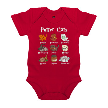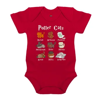 Potter Cats, Βρεφικό φορμάκι μωρού, ΚΟΚΚΙΝΟ, 100% Organic Cotton, κοντομάνικο