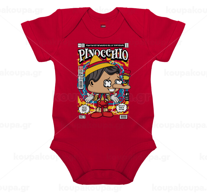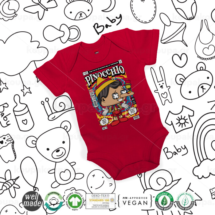 Pinocchio, Βρεφικό φορμάκι μωρού, ΚΟΚΚΙΝΟ, 100% Organic Cotton, κοντομάνικο