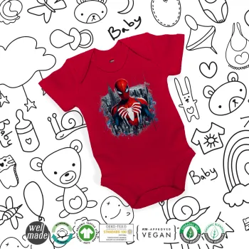 Spiderman City, Βρεφικό φορμάκι μωρού, ΚΟΚΚΙΝΟ, 100% Organic Cotton, κοντομάνικο