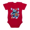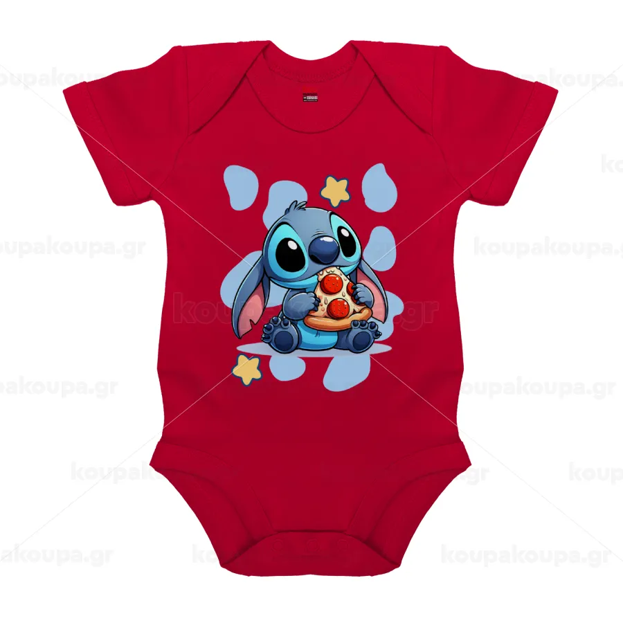 Stitch Pizza, Βρεφικό φορμάκι μωρού, ΚΟΚΚΙΝΟ, 100% Organic Cotton, κοντομάνικο