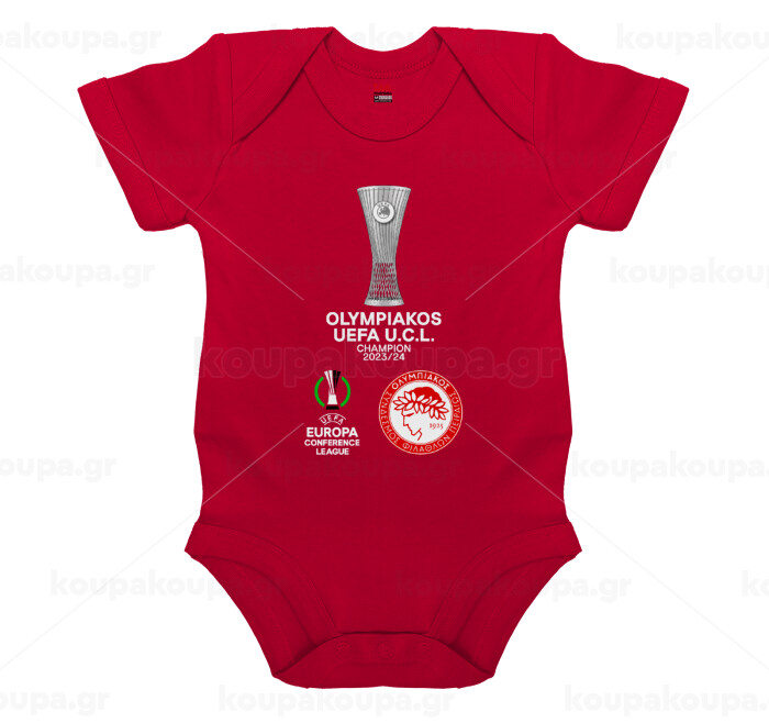 Ολυμπιακός νικητής UEFA Europa Conference League Champion 2023/24, Βρεφικό φορμάκι μωρού, ΚΟΚΚΙΝΟ, 100% Organic Cotton, κοντομάνικο