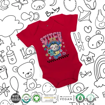 Labubu Stitch, Βρεφικό φορμάκι μωρού, ΚΟΚΚΙΝΟ, 100% Organic Cotton, κοντομάνικο