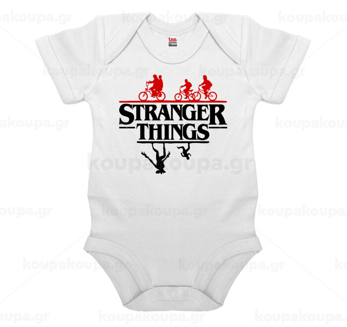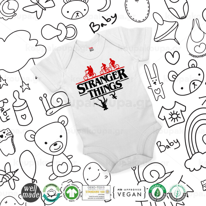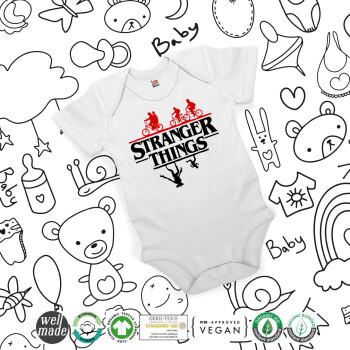 Stranger Things upside down, Βρεφικό φορμάκι μωρού, 0-24 μηνών, ΛΕΥΚΟ, 100% Organic Cotton, κοντομάνικο