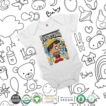 Pinocchio, Βρεφικό φορμάκι μωρού, 0-24 μηνών, ΛΕΥΚΟ, 100% Organic Cotton, κοντομάνικο