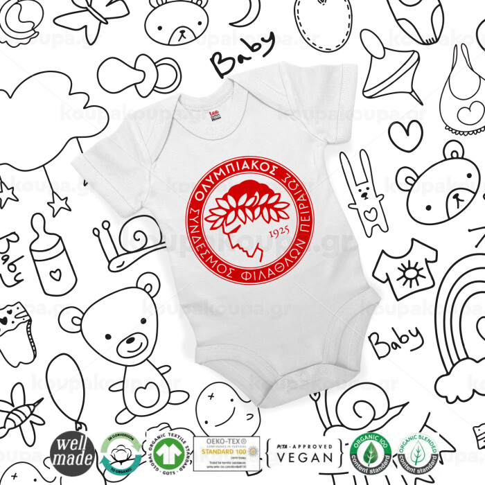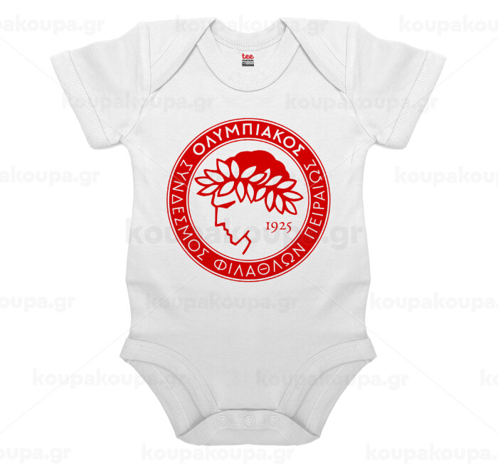 Ολυμπιακός, Βρεφικό φορμάκι μωρού, 0-24 μηνών, ΛΕΥΚΟ, 100% Organic Cotton, κοντομάνικο