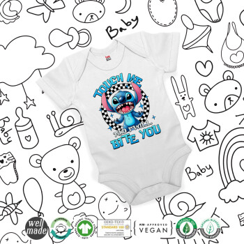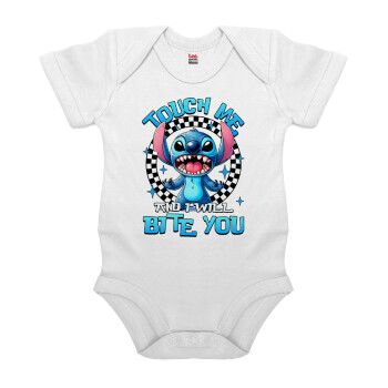 Stitch Touch Me And I Will Bite You, Βρεφικό φορμάκι μωρού, 0-24 μηνών, ΛΕΥΚΟ, 100% Organic Cotton, κοντομάνικο