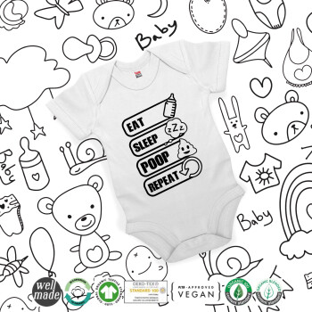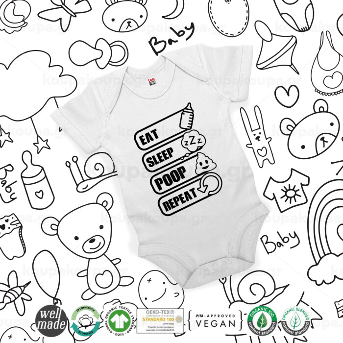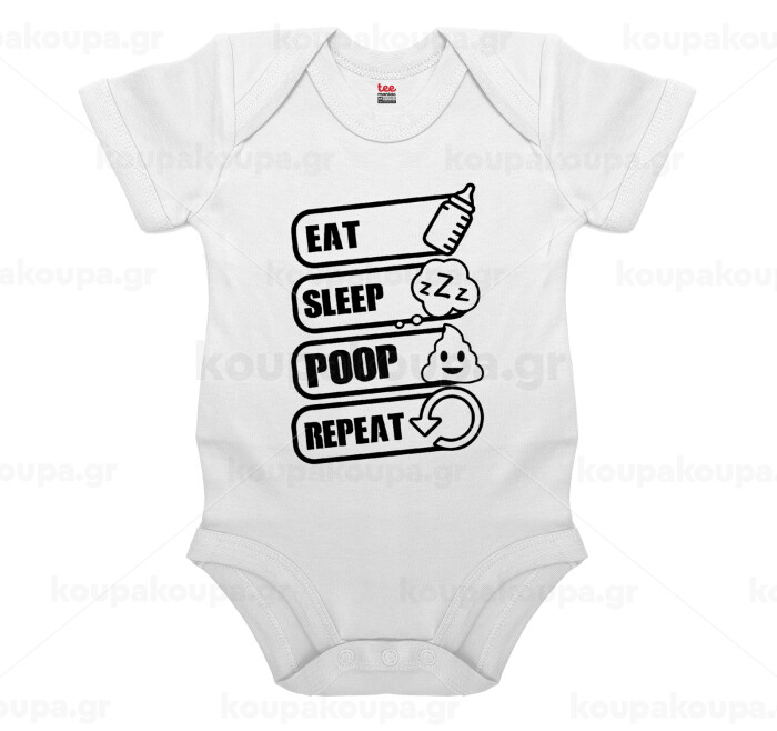 Eat, Sleep, Poop, Repeat, Βρεφικό φορμάκι μωρού, 0-24 μηνών, ΛΕΥΚΟ, 100% Organic Cotton, κοντομάνικο