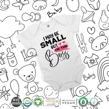 I may be small but I'm the boss, Βρεφικό φορμάκι μωρού, 0-24 μηνών, ΛΕΥΚΟ, 100% Organic Cotton, κοντομάνικο