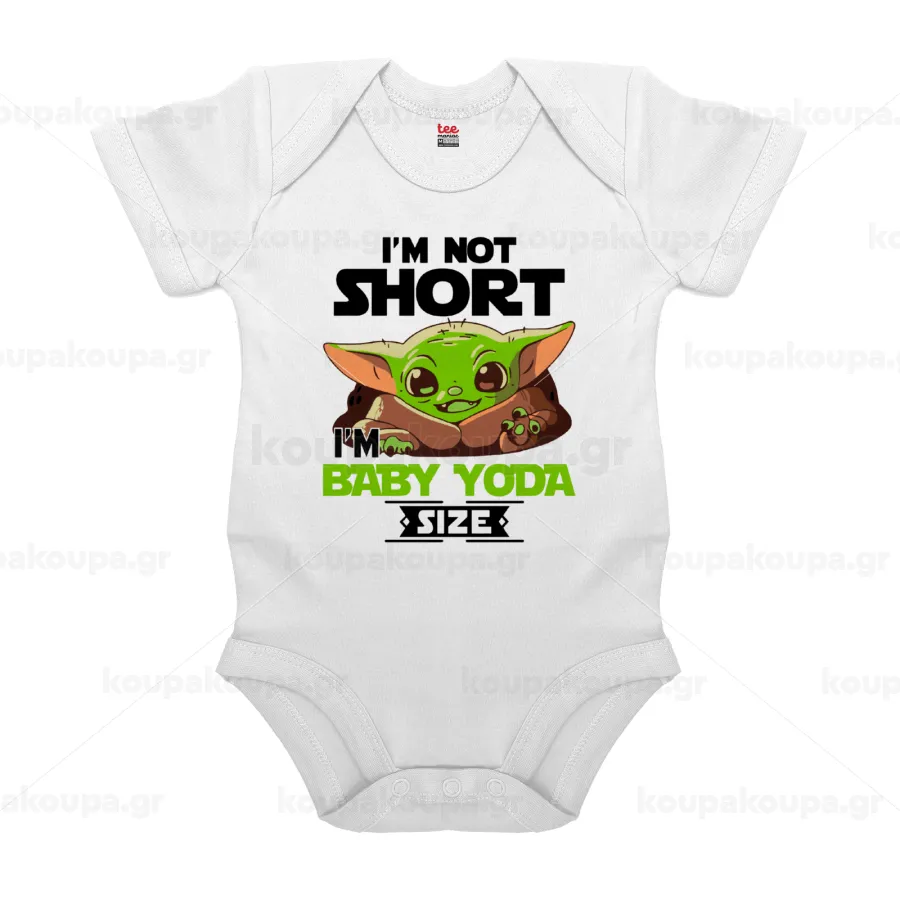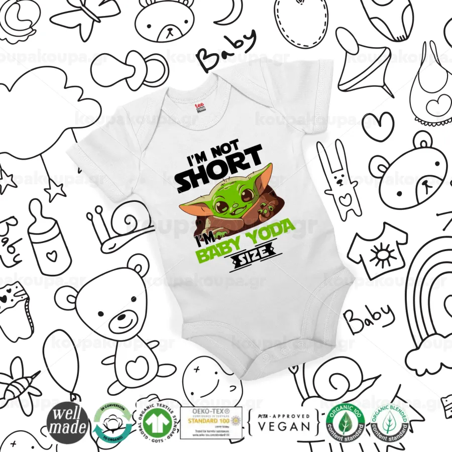 I'm not short, i'm Baby Yoda size, Βρεφικό φορμάκι μωρού, 0-24 μηνών, ΛΕΥΚΟ, 100% Organic Cotton, κοντομάνικο