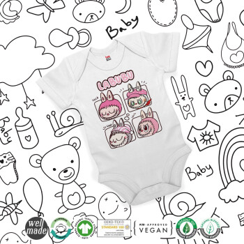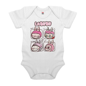 Labubu pink, Βρεφικό φορμάκι μωρού, 0-24 μηνών, ΛΕΥΚΟ, 100% Organic Cotton, κοντομάνικο