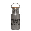 World's Best Doctor, Μεταλλικό παγούρι θερμός (Stainless steel) Ασημένιο με ξύλινο καπακι (bamboo), διπλού τοιχώματος, 350ml