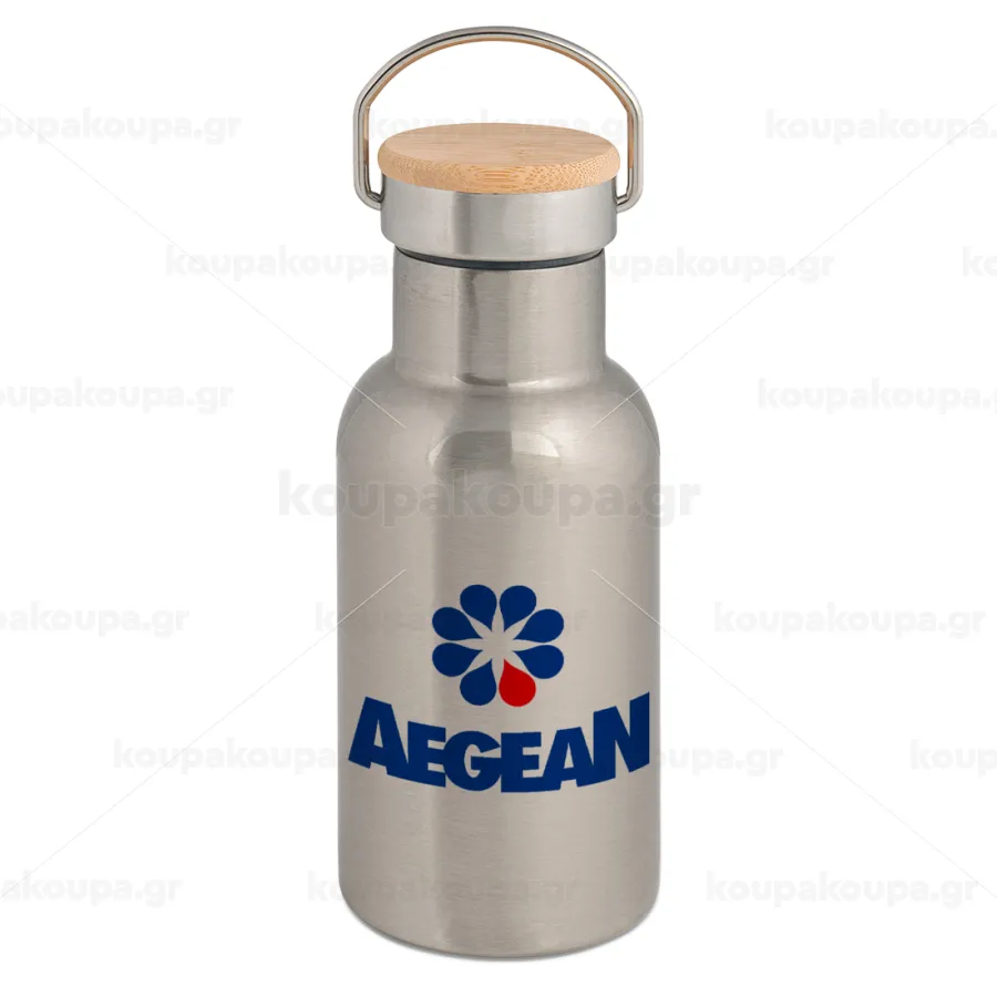Πρατήριο καυσίμων AEGEAN, Μεταλλικό παγούρι θερμός (Stainless steel) Ασημένιο με ξύλινο καπακι (bamboo), διπλού τοιχώματος, 350ml