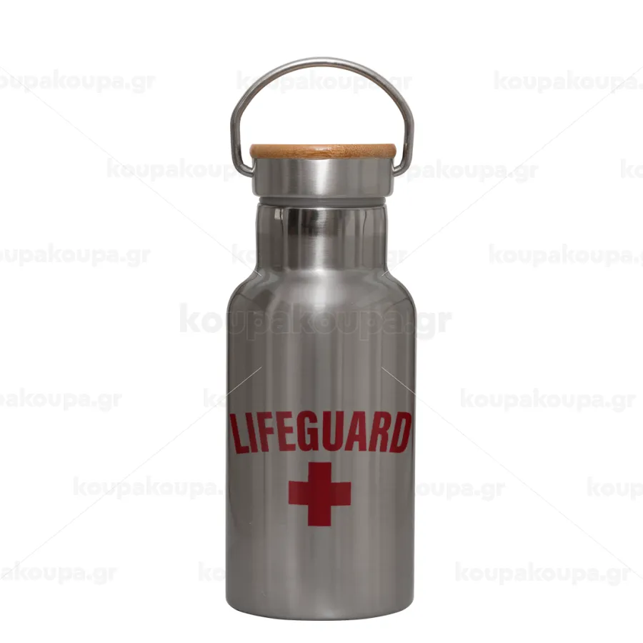 Lifeguard, Μεταλλικό παγούρι θερμός (Stainless steel) Ασημένιο με ξύλινο καπακι (bamboo), διπλού τοιχώματος, 350ml