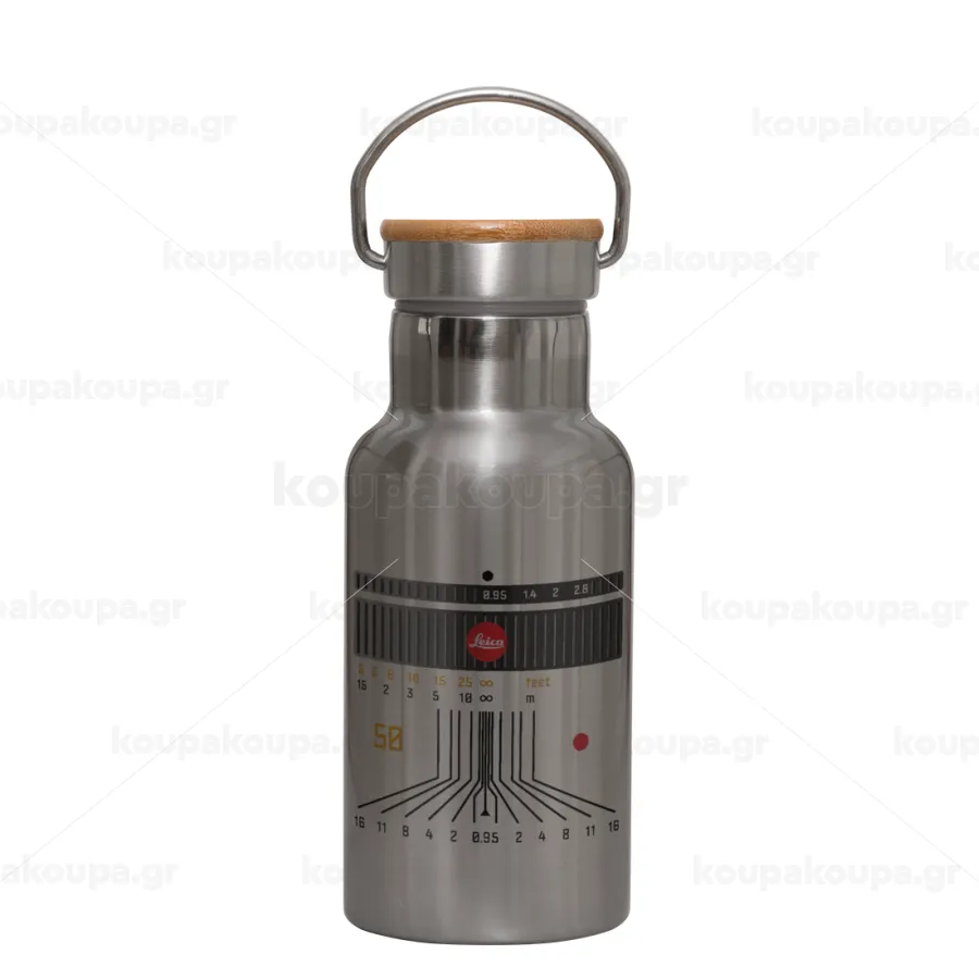 Leica Lens, Μεταλλικό παγούρι θερμός (Stainless steel) Ασημένιο με ξύλινο καπακι (bamboo), διπλού τοιχώματος, 350ml