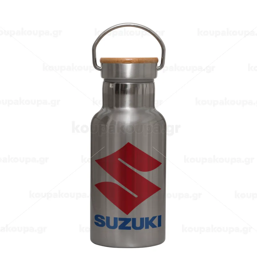 SUZUKI, Μεταλλικό παγούρι θερμός (Stainless steel) Ασημένιο με ξύλινο καπακι (bamboo), διπλού τοιχώματος, 350ml