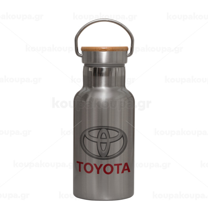 Toyota, Μεταλλικό παγούρι θερμός (Stainless steel) Ασημένιο με ξύλινο καπακι (bamboo), διπλού τοιχώματος, 350ml