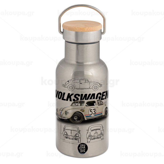 Volkswagen Beetle, Μεταλλικό παγούρι θερμός (Stainless steel) Ασημένιο με ξύλινο καπακι (bamboo), διπλού τοιχώματος, 350ml