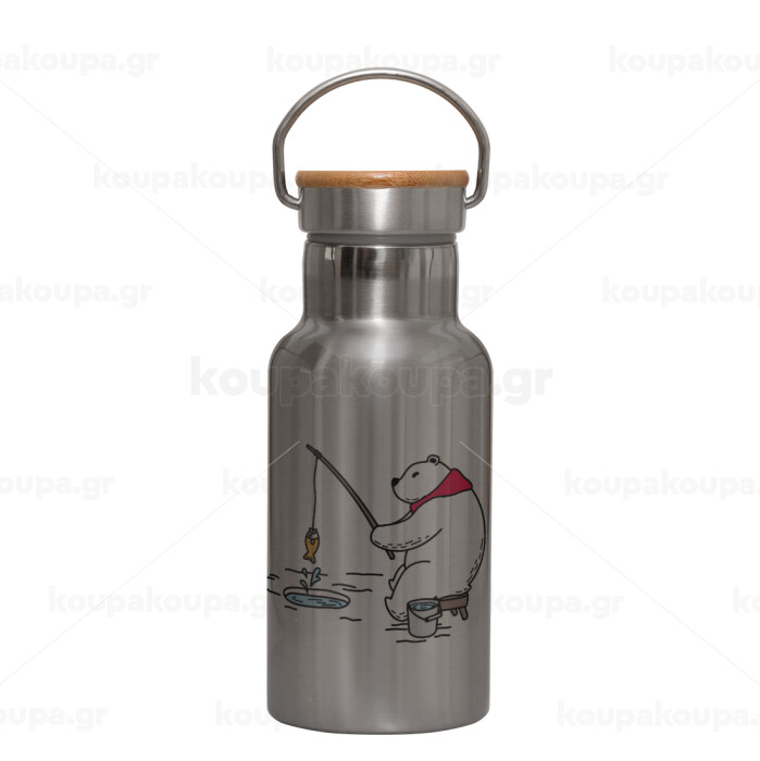 Αρκούδα ψαρεύει, Μεταλλικό παγούρι θερμός (Stainless steel) Ασημένιο με ξύλινο καπακι (bamboo), διπλού τοιχώματος, 350ml