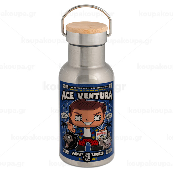 Ace Ventura: Pet Detective, Μεταλλικό παγούρι θερμός (Stainless steel) Ασημένιο με ξύλινο καπακι (bamboo), διπλού τοιχώματος, 350ml