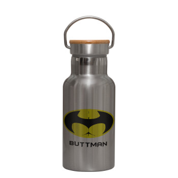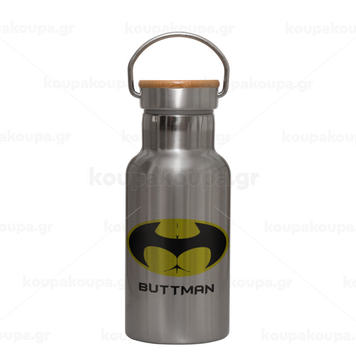 Buttman, Μεταλλικό παγούρι θερμός (Stainless steel) Ασημένιο με ξύλινο καπακι (bamboo), διπλού τοιχώματος, 350ml