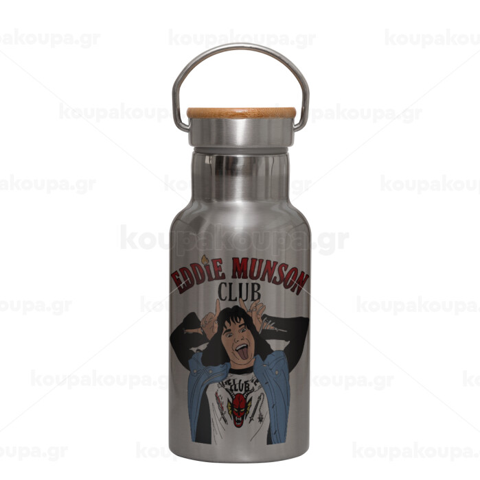 Eddie Munson, Μεταλλικό παγούρι θερμός (Stainless steel) Ασημένιο με ξύλινο καπακι (bamboo), διπλού τοιχώματος, 350ml