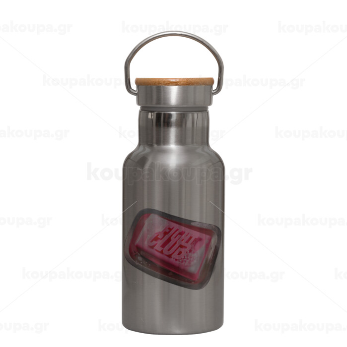 Fight Club, Μεταλλικό παγούρι θερμός (Stainless steel) Ασημένιο με ξύλινο καπακι (bamboo), διπλού τοιχώματος, 350ml