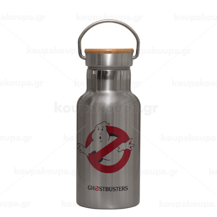 Ghostbusters, Μεταλλικό παγούρι θερμός (Stainless steel) Ασημένιο με ξύλινο καπακι (bamboo), διπλού τοιχώματος, 350ml