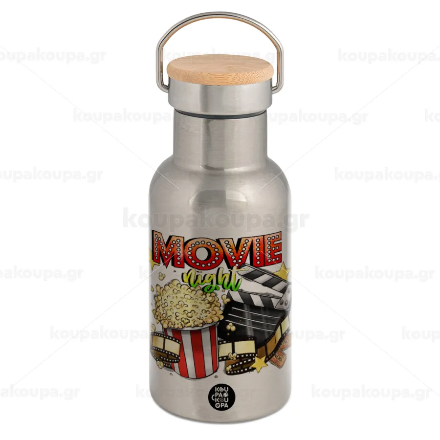 Movie night, Μεταλλικό παγούρι θερμός (Stainless steel) Ασημένιο με ξύλινο καπακι (bamboo), διπλού τοιχώματος, 350ml