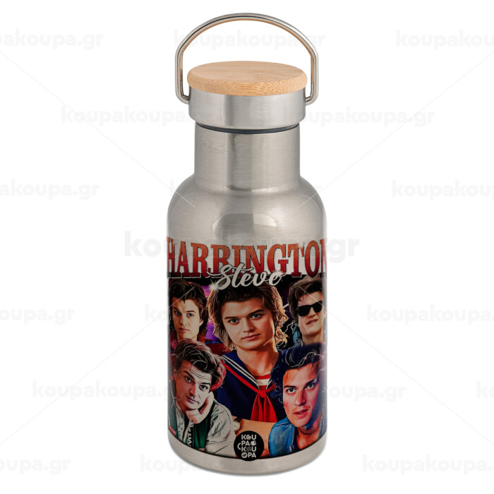 Steve Harrington, Stranger Things, Μεταλλικό παγούρι θερμός (Stainless steel) Ασημένιο με ξύλινο καπακι (bamboo), διπλού τοιχώματος, 350ml