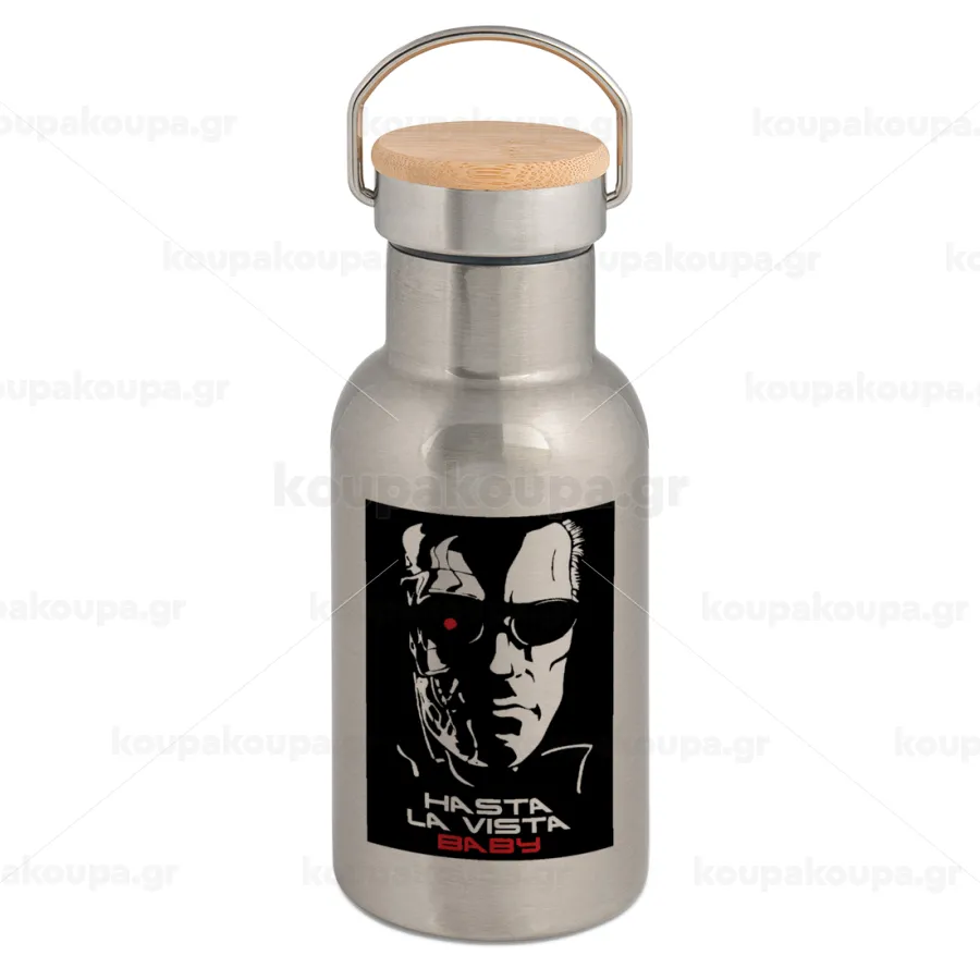 Terminator Hasta La Vista, Μεταλλικό παγούρι θερμός (Stainless steel) Ασημένιο με ξύλινο καπακι (bamboo), διπλού τοιχώματος, 350ml